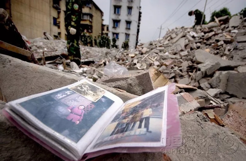 △2008年5月15日 地震过后的都江堰市,废墟中一本残留下来的相册静静躺在废墟上。
